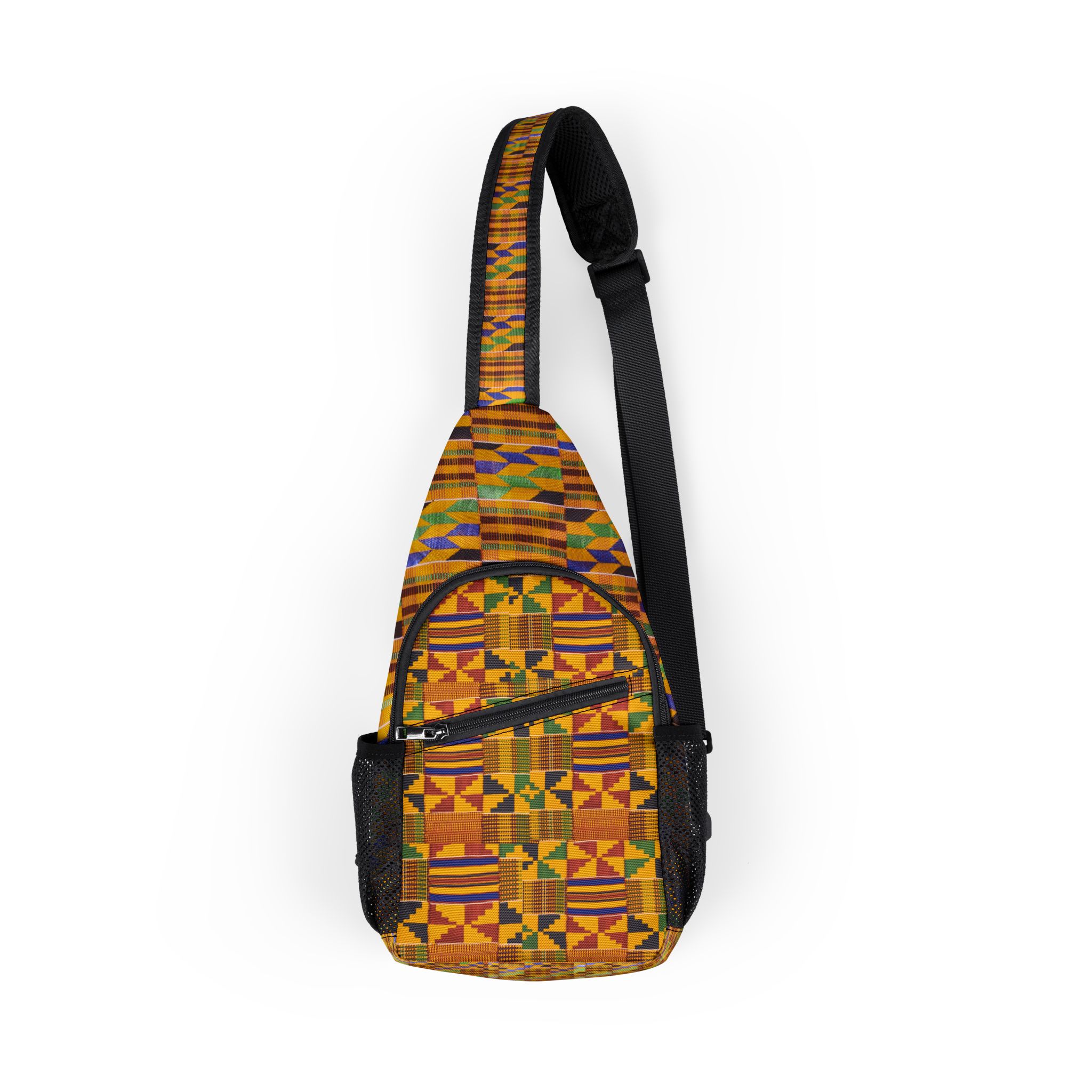 Carry your essentials with purpose. This chest bag features a vibrant kente-inspired print that turns every errand into a small act of cultural celebration. The bold weave of color and pattern sits against black detailing for contrast and durability. Inside, the roomy main compartment organizes your day with two zip pockets and two mesh side pockets for easy access to phone, keys, and a compact water bottle. The adjustable shoulder strap lets you wear it across the chest or back, keeping your hands free while you move. With 30% of each sale dedicated to purchasing solar generators and lamps for communities in need, this bag does more than hold your things — it helps bring light where it’s needed most.