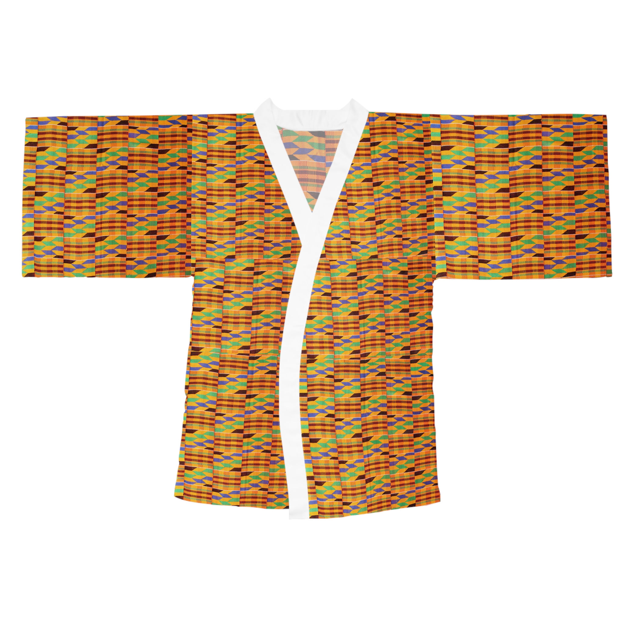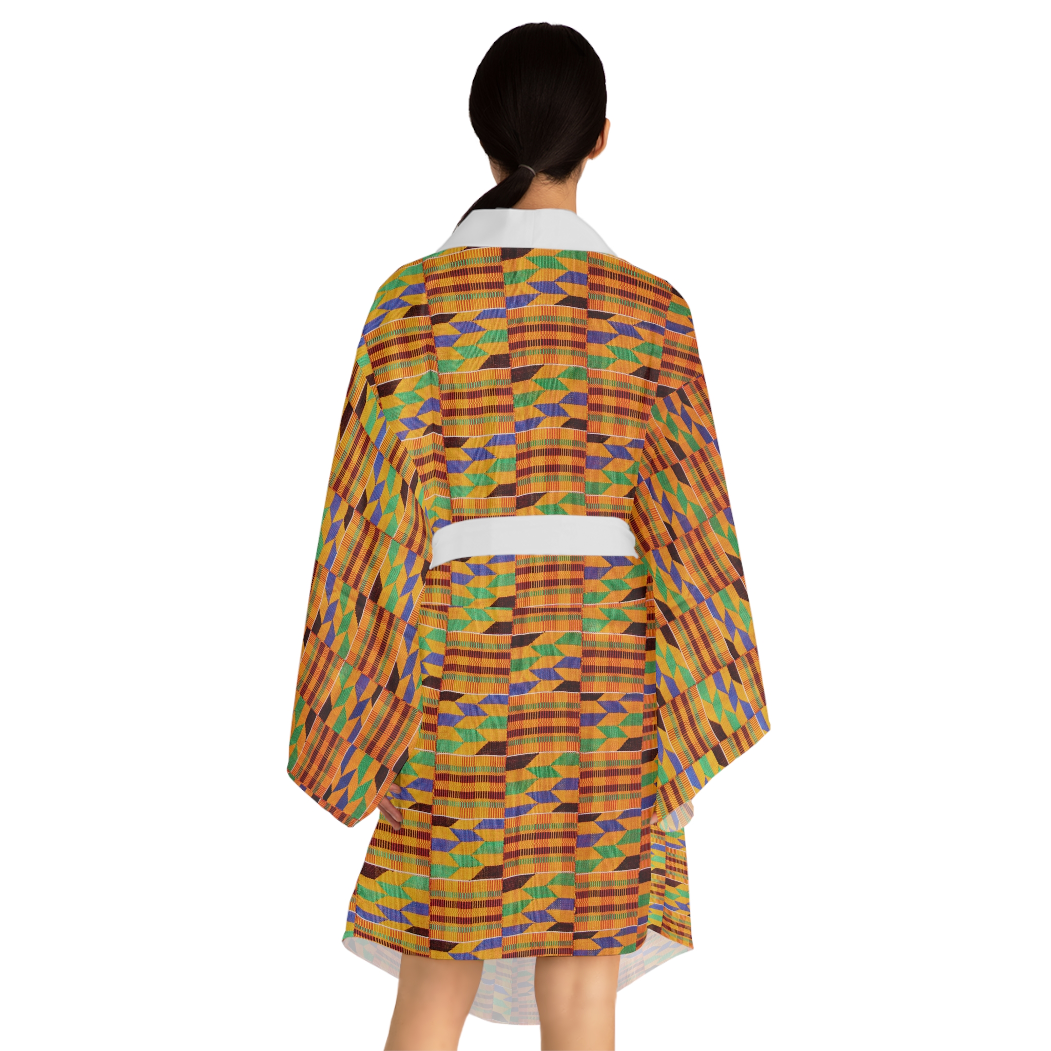 This mid-length kimono robe brings warm, woven energy into every room you enter. Lightweight and silky to the touch, it slips on easily and drapes with soft bell sleeves that move like relaxed conversation. The vibrant, repeated patterned print carries an artisan feel — bright ochres, deep rusts and jewel accents layered into a geometric weave — so the robe reads as both lounge piece and statement outer layer when you want color and confidence. The belted waist sculpts a flattering silhouette while the smooth polyester keeps the fabric resilient and quick-drying for everyday wear and travel. Choose the classic black or white contrast trim and belt to ground the print and let the pattern do the talking. Wear it at home during slow mornings, bring it to casual gatherings, or pair it with tailored bottoms for an evening with friends.