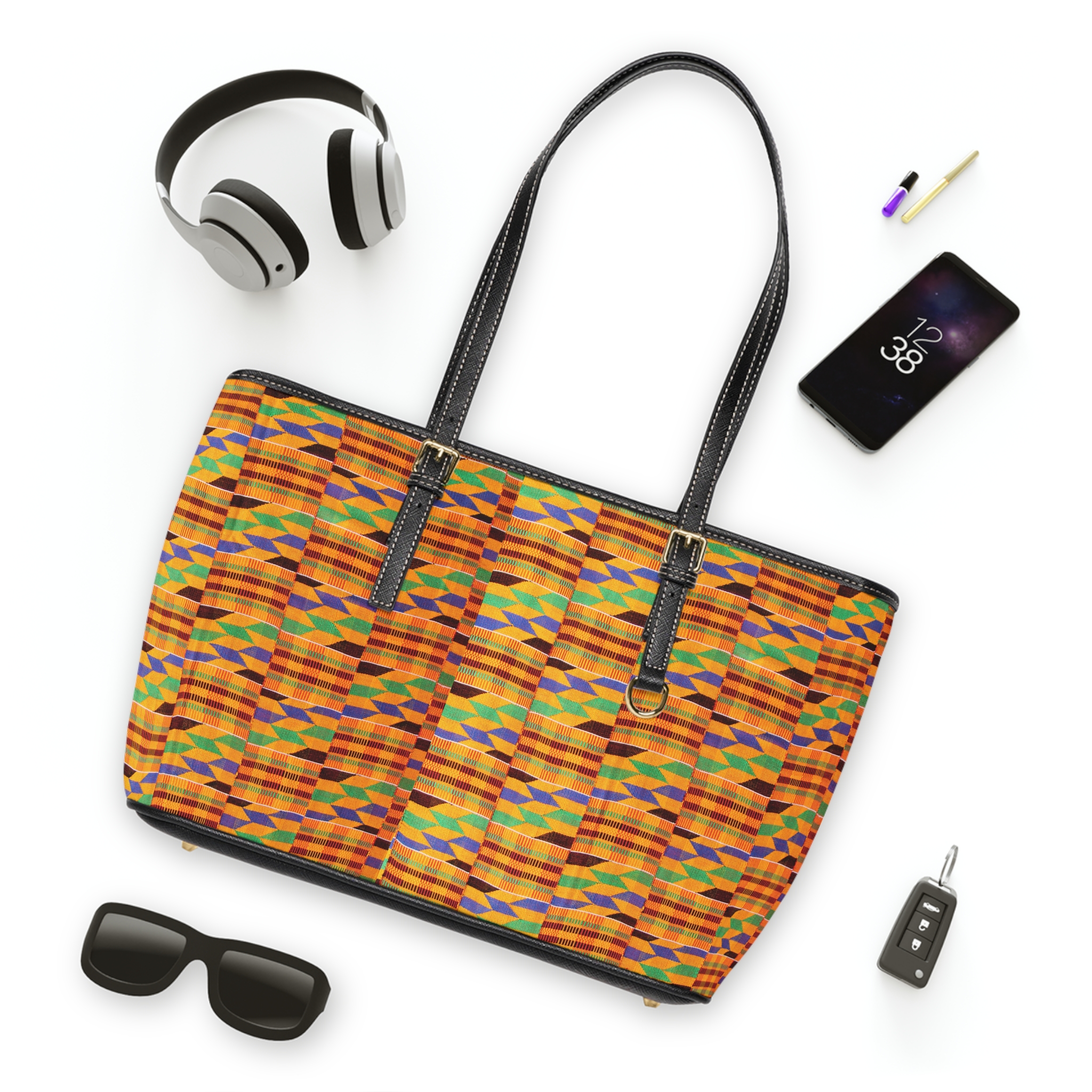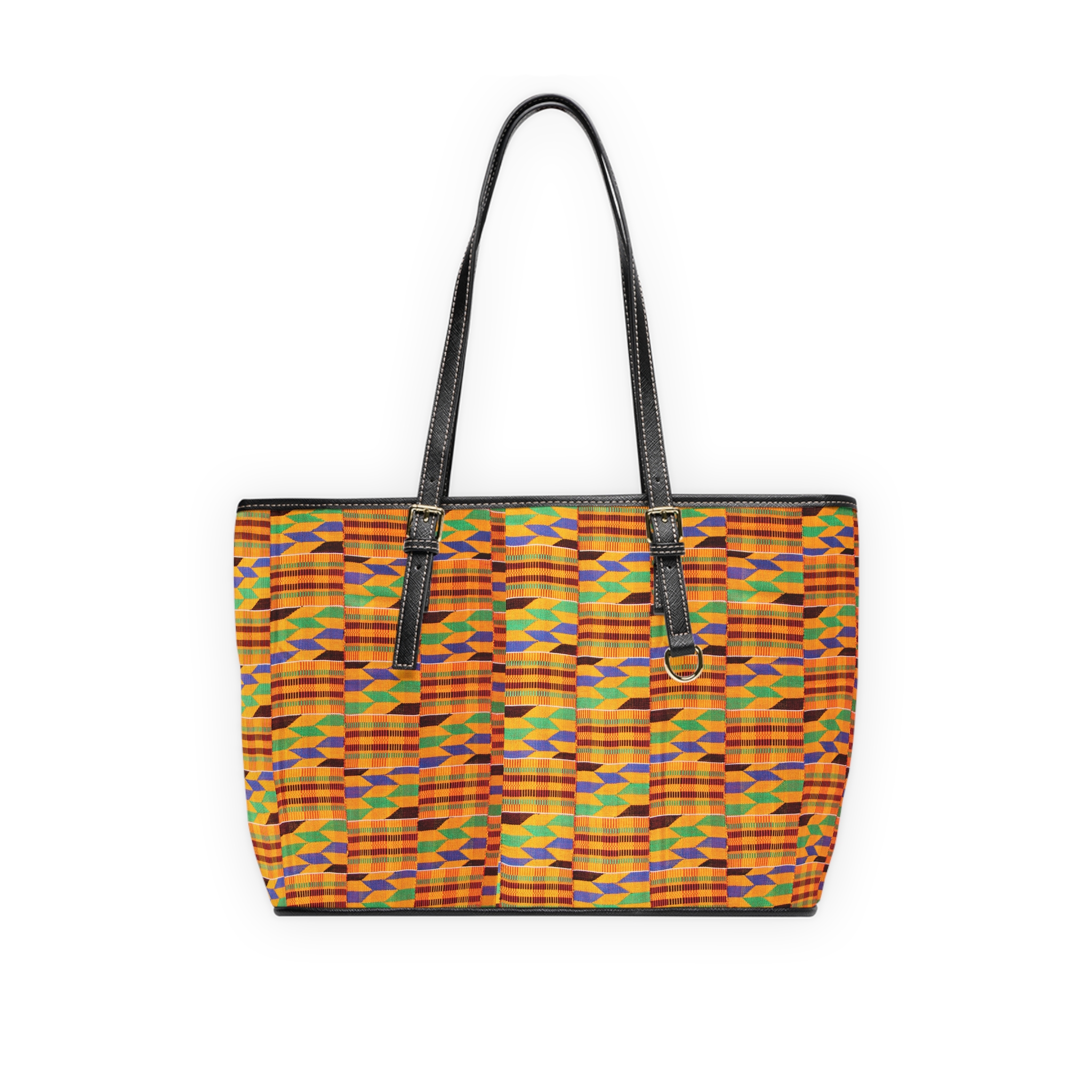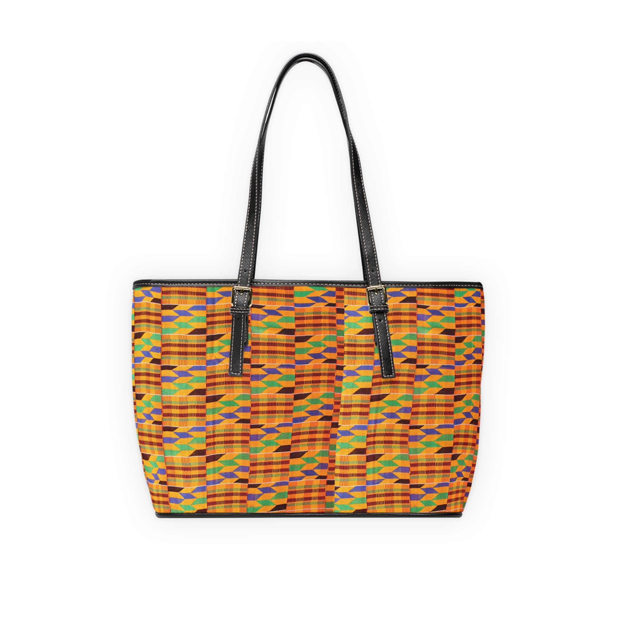 This PU leather shoulder bag carries a bold Kente-inspired Amunra print that reads like a statement — bright, cultural, and purposeful. The double-sided design pops with vivid colors on high-grade PU leather and a smooth polyester lining inside. Adjustable handles and two size options let you carry it as a compact everyday companion or a roomier tote for markets and events. Inside, a zip pocket and two open pockets keep small essentials organized while gold-colored zipper and buckle accents add refined contrast to the vibrant textile motif. More than style: 30% of each sale supports solar generators and solar lamps for communities in need, so the bag becomes a wearable act of practical solidarity.