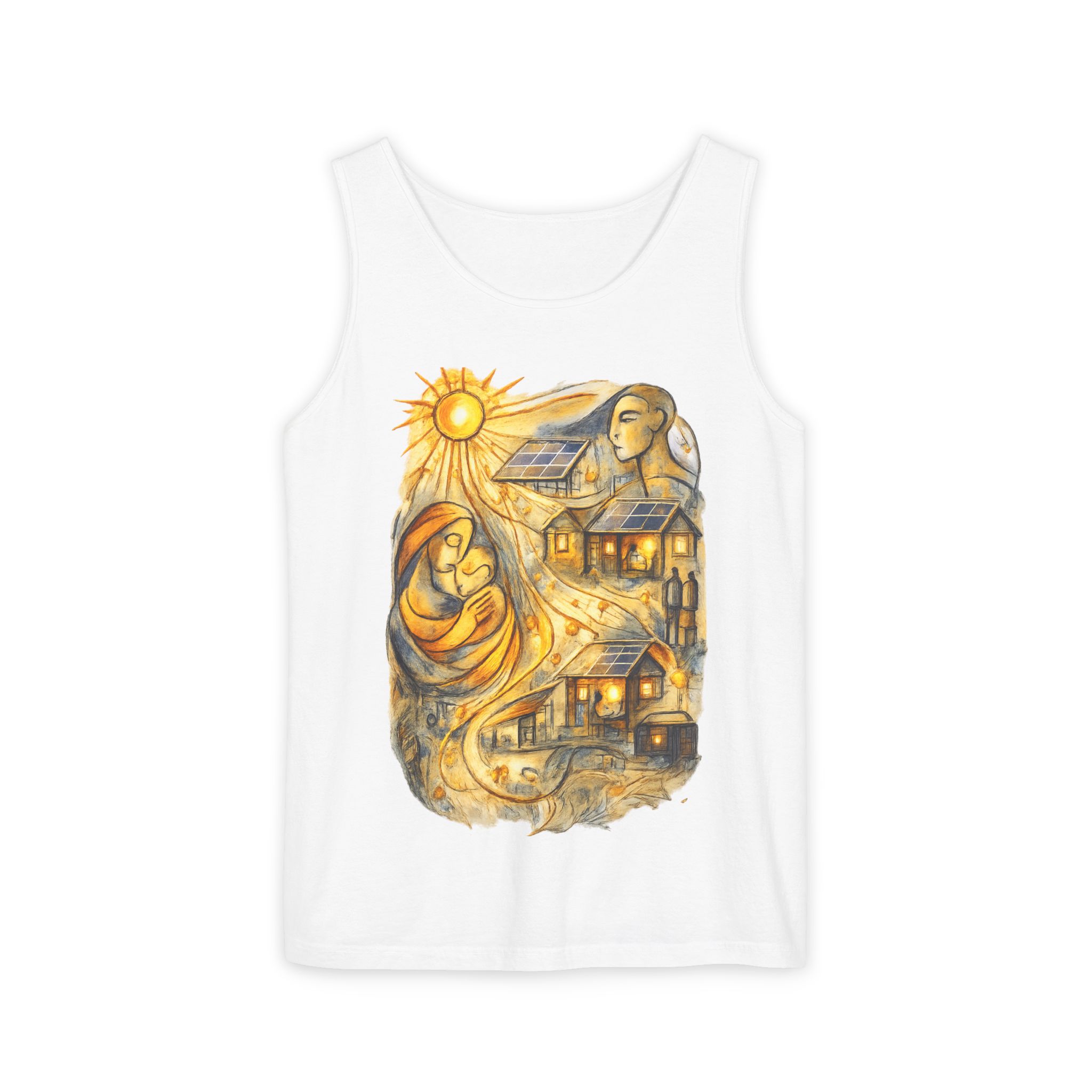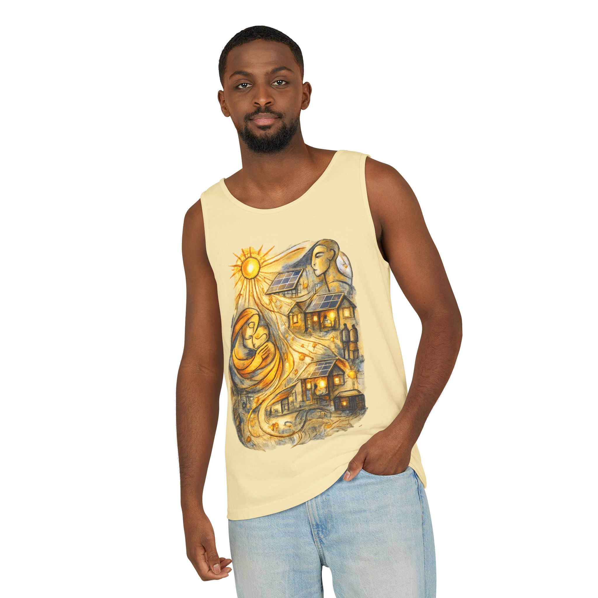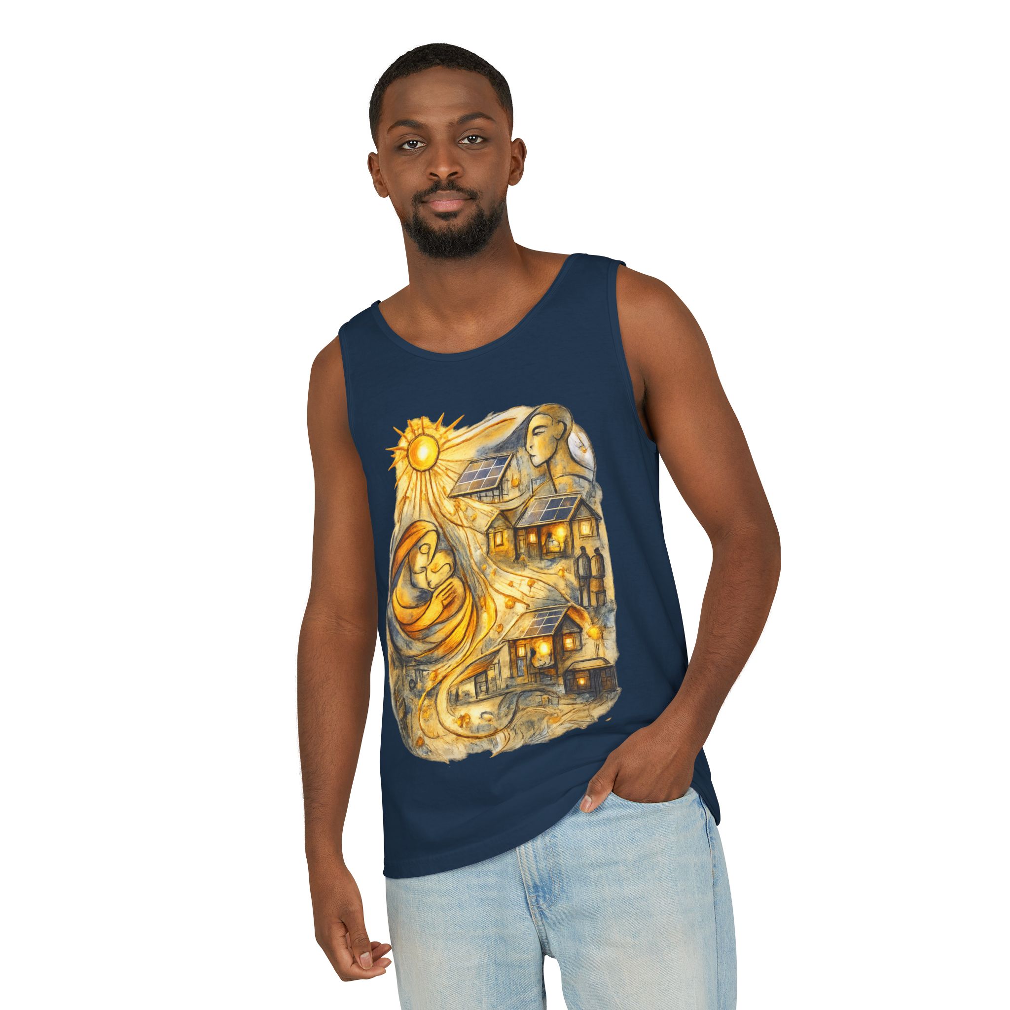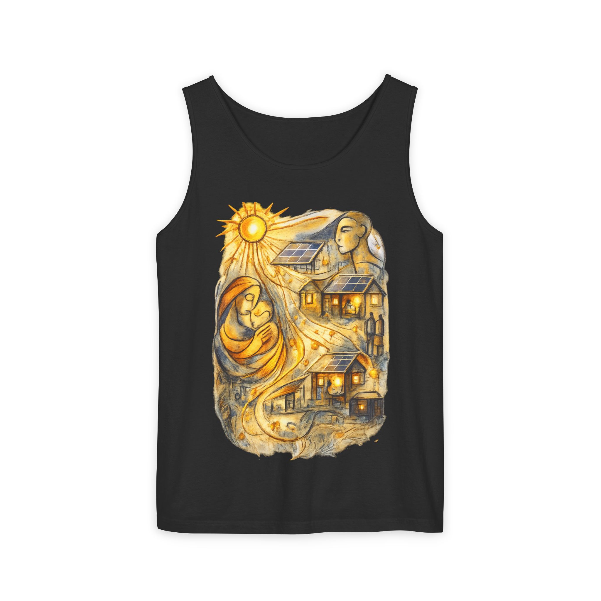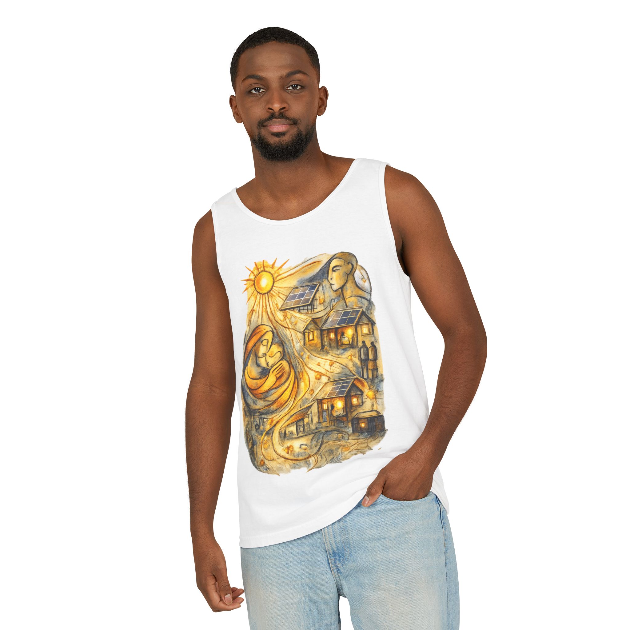 This tank top carries the warm glow of sunlight village art and a purpose that reaches beyond fabric. The back features bold, hand-drawn artwork that evokes roofs, lanterns and dawn spilling over a small community — a quiet celebration of light and resilience. Wearing it feels like joining a small movement: 30% of the sale supports solar lamps and a solar generator project for communities in need. Soft, lived-in color and a relaxed silhouette let the image breathe while keeping you comfortable during long summer days, community events, or volunteer work. It’s the kind of piece you reach for when you want your clothes to say something: that light matters, and you’re helping bring it.
