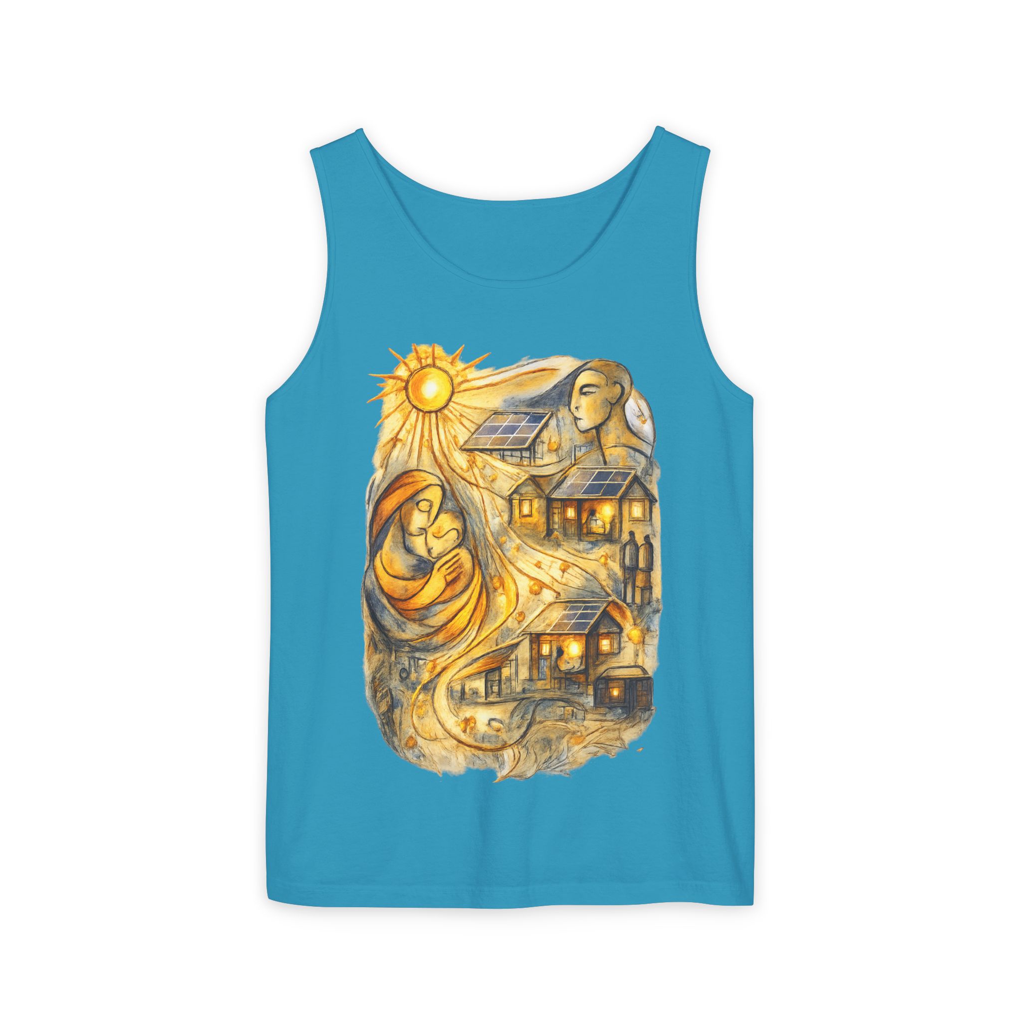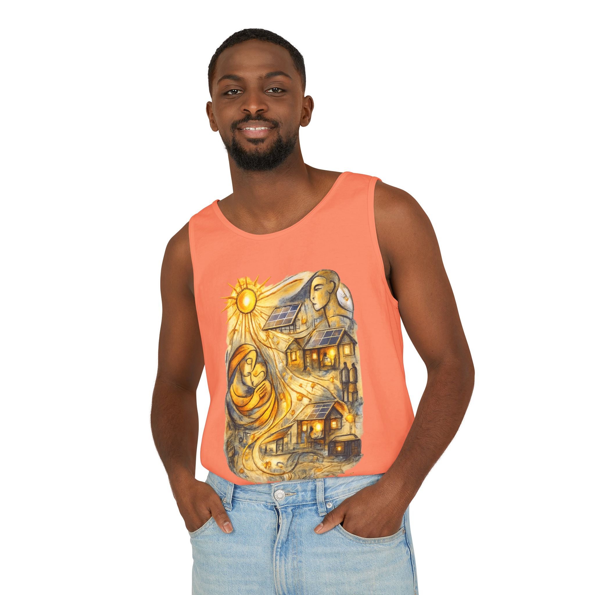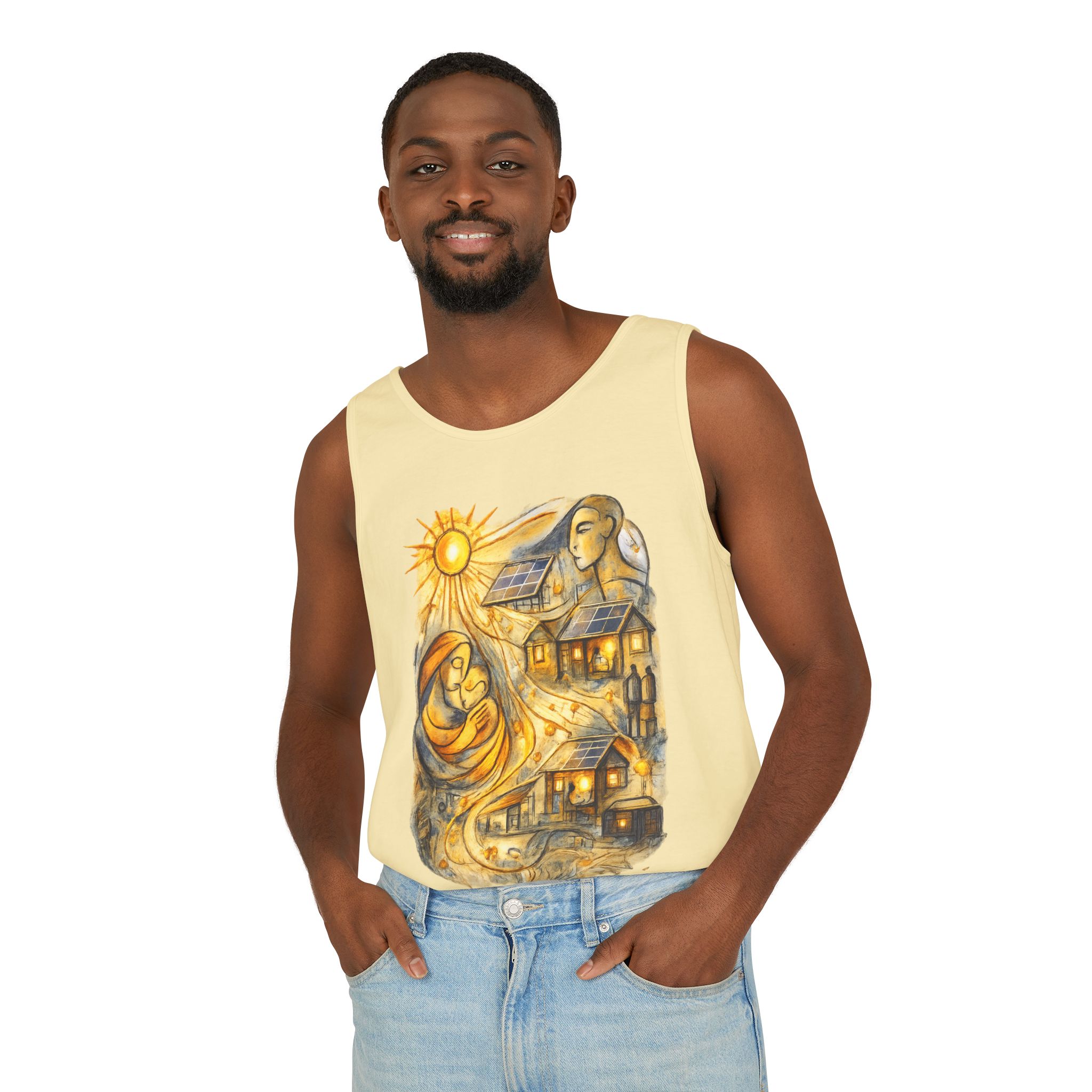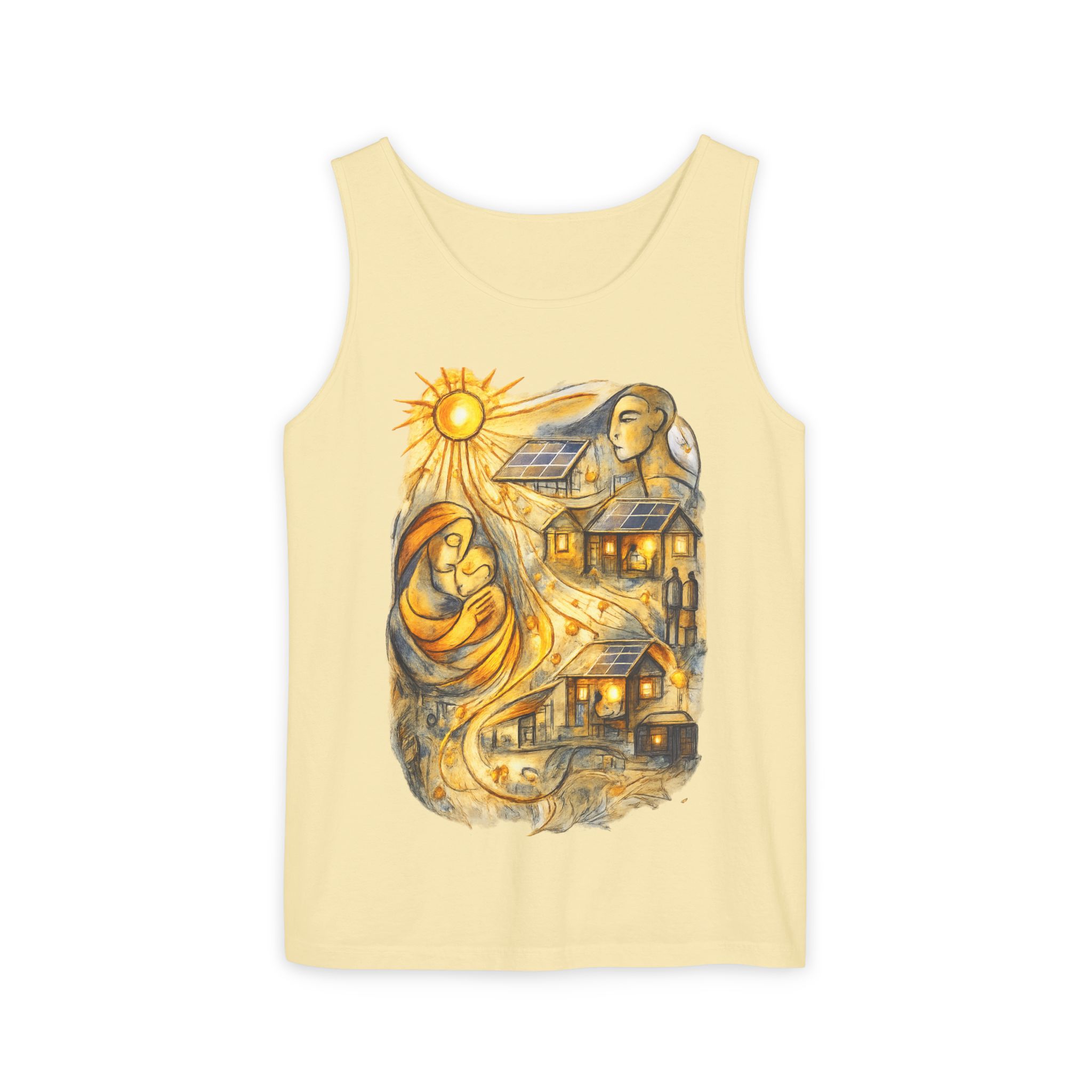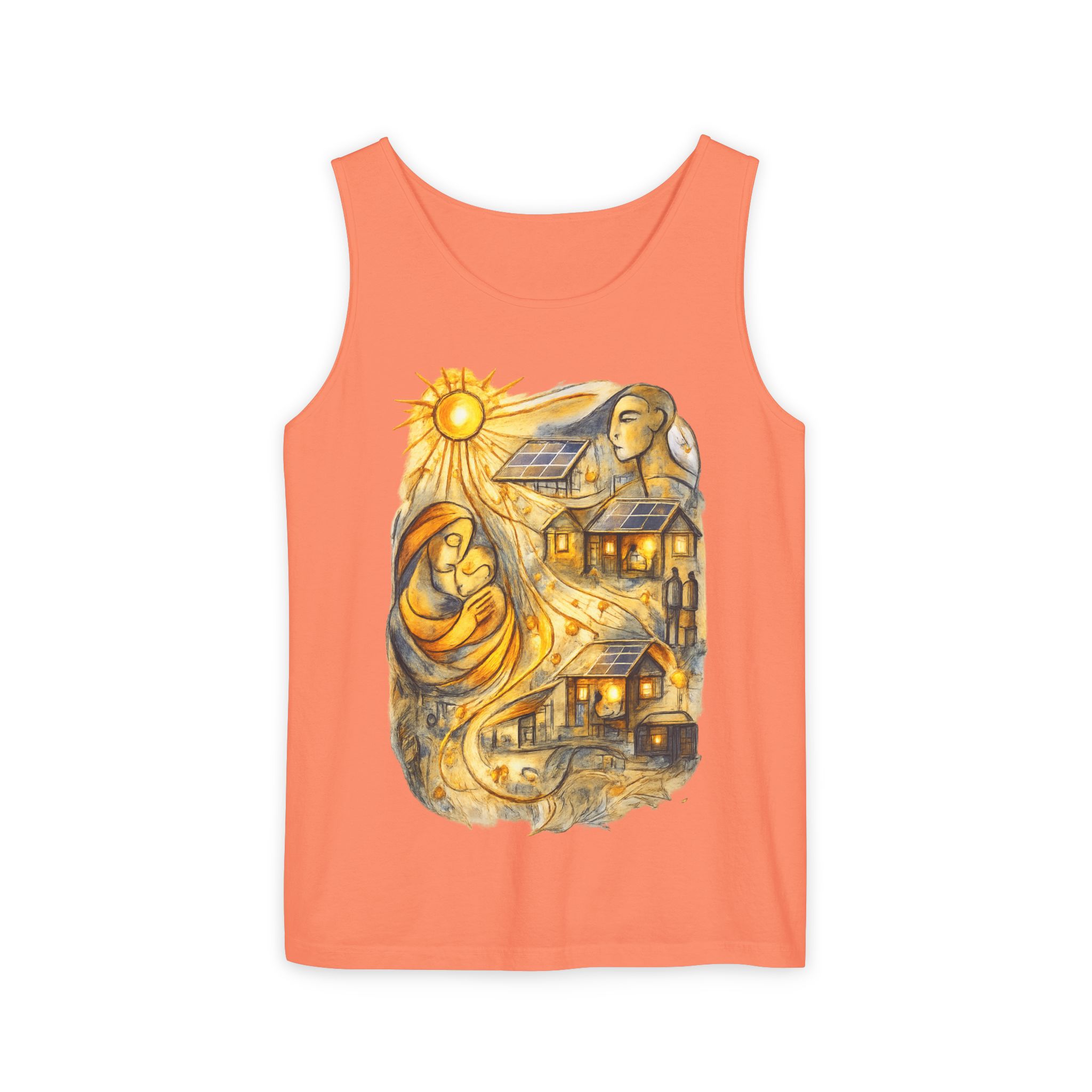 This tank top carries the warm glow of sunlight village art and a purpose that reaches beyond fabric. The back features bold, hand-drawn artwork that evokes roofs, lanterns and dawn spilling over a small community — a quiet celebration of light and resilience. Wearing it feels like joining a small movement: 30% of the sale supports solar lamps and a solar generator project for communities in need. Soft, lived-in color and a relaxed silhouette let the image breathe while keeping you comfortable during long summer days, community events, or volunteer work. It’s the kind of piece you reach for when you want your clothes to say something: that light matters, and you’re helping bring it.