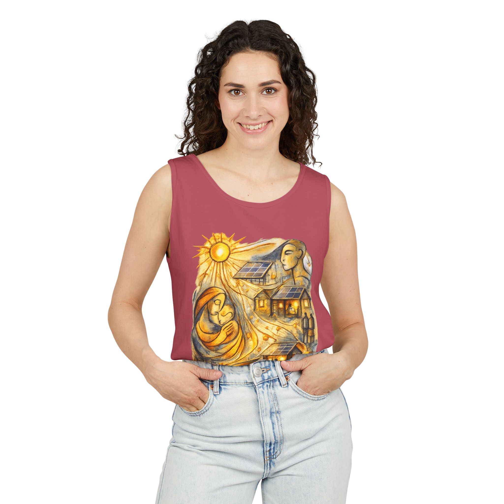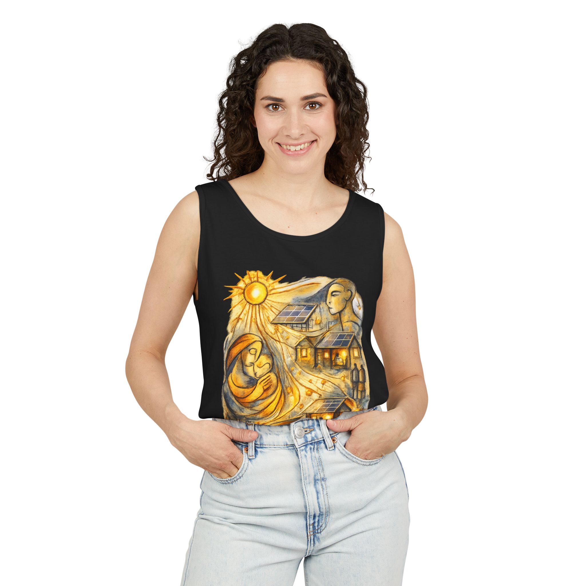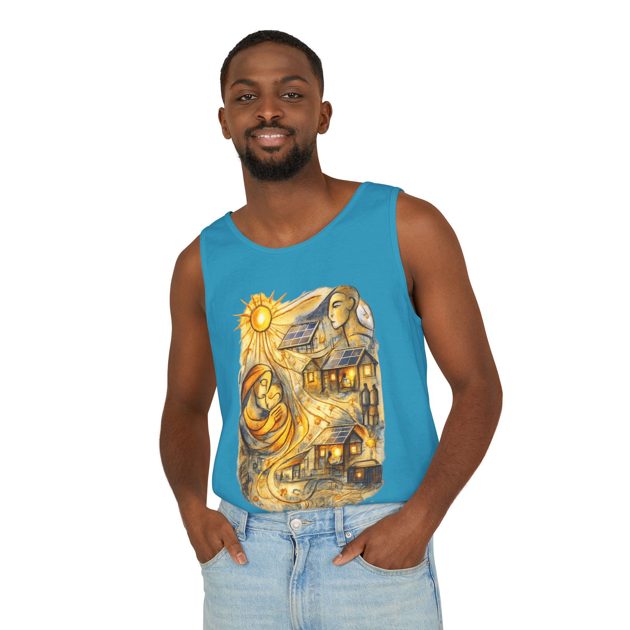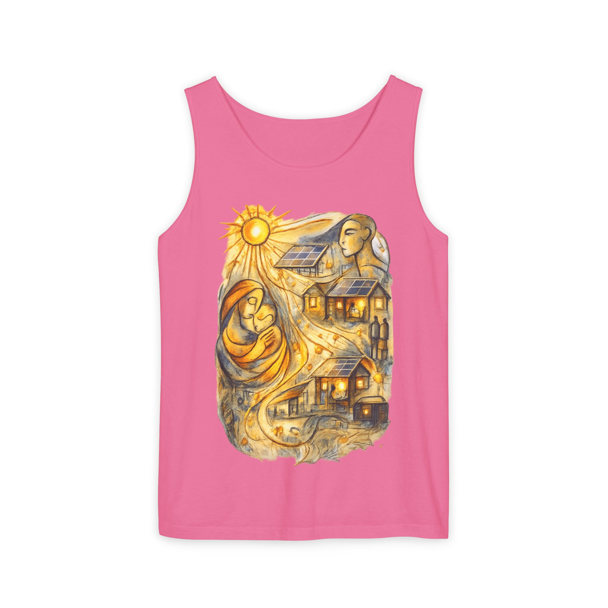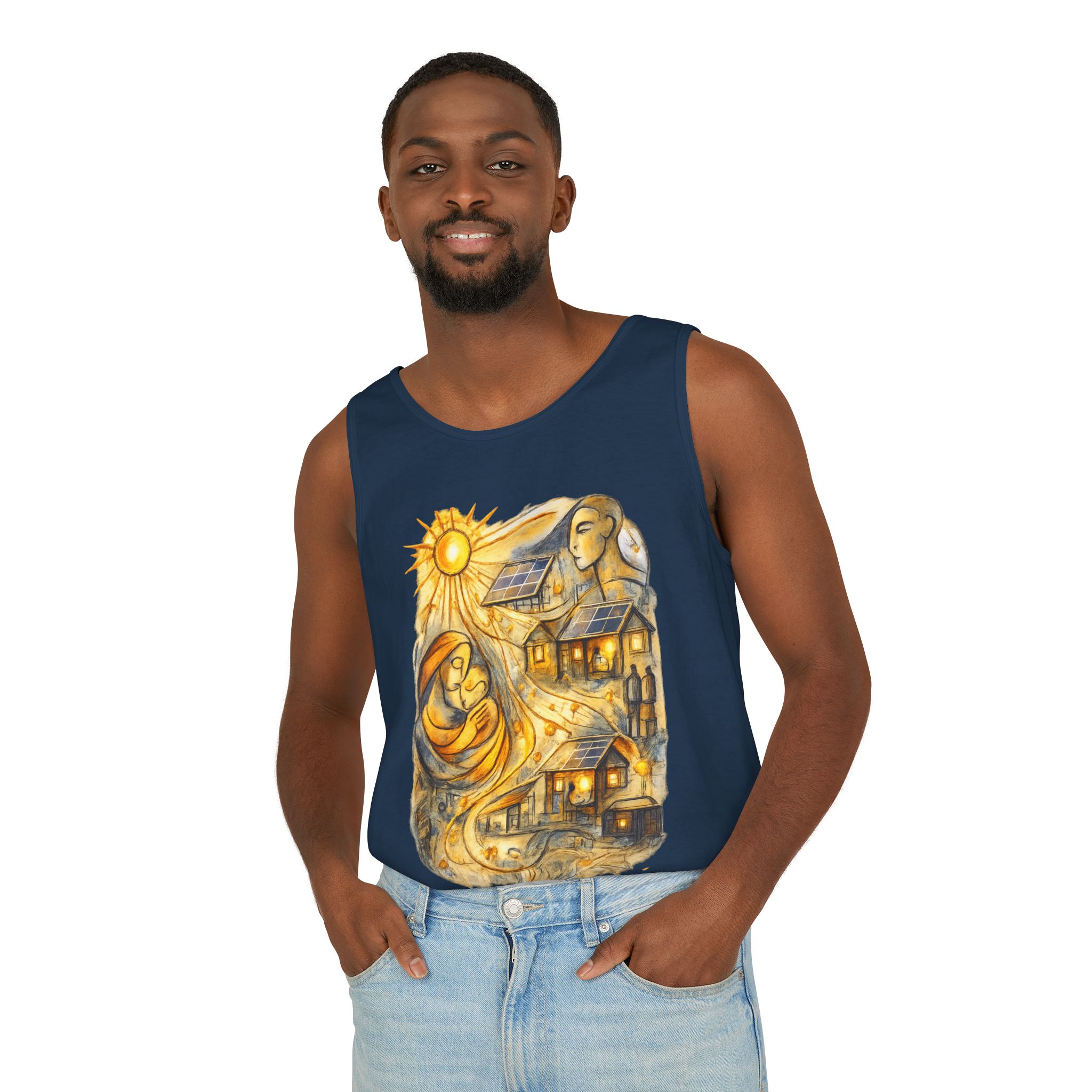 This tank top carries the warm glow of sunlight village art and a purpose that reaches beyond fabric. The back features bold, hand-drawn artwork that evokes roofs, lanterns and dawn spilling over a small community — a quiet celebration of light and resilience. Wearing it feels like joining a small movement: 30% of the sale supports solar lamps and a solar generator project for communities in need. Soft, lived-in color and a relaxed silhouette let the image breathe while keeping you comfortable during long summer days, community events, or volunteer work. It’s the kind of piece you reach for when you want your clothes to say something: that light matters, and you’re helping bring it.