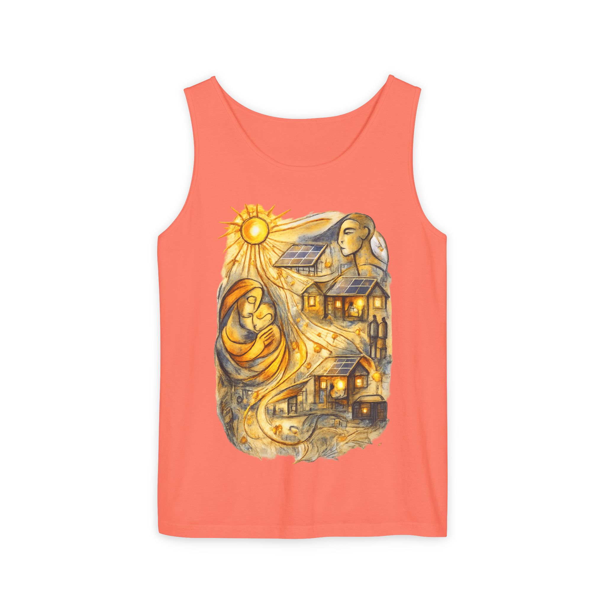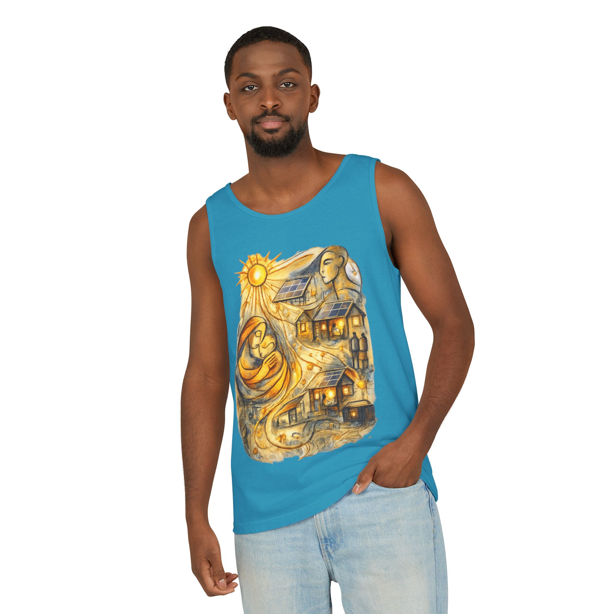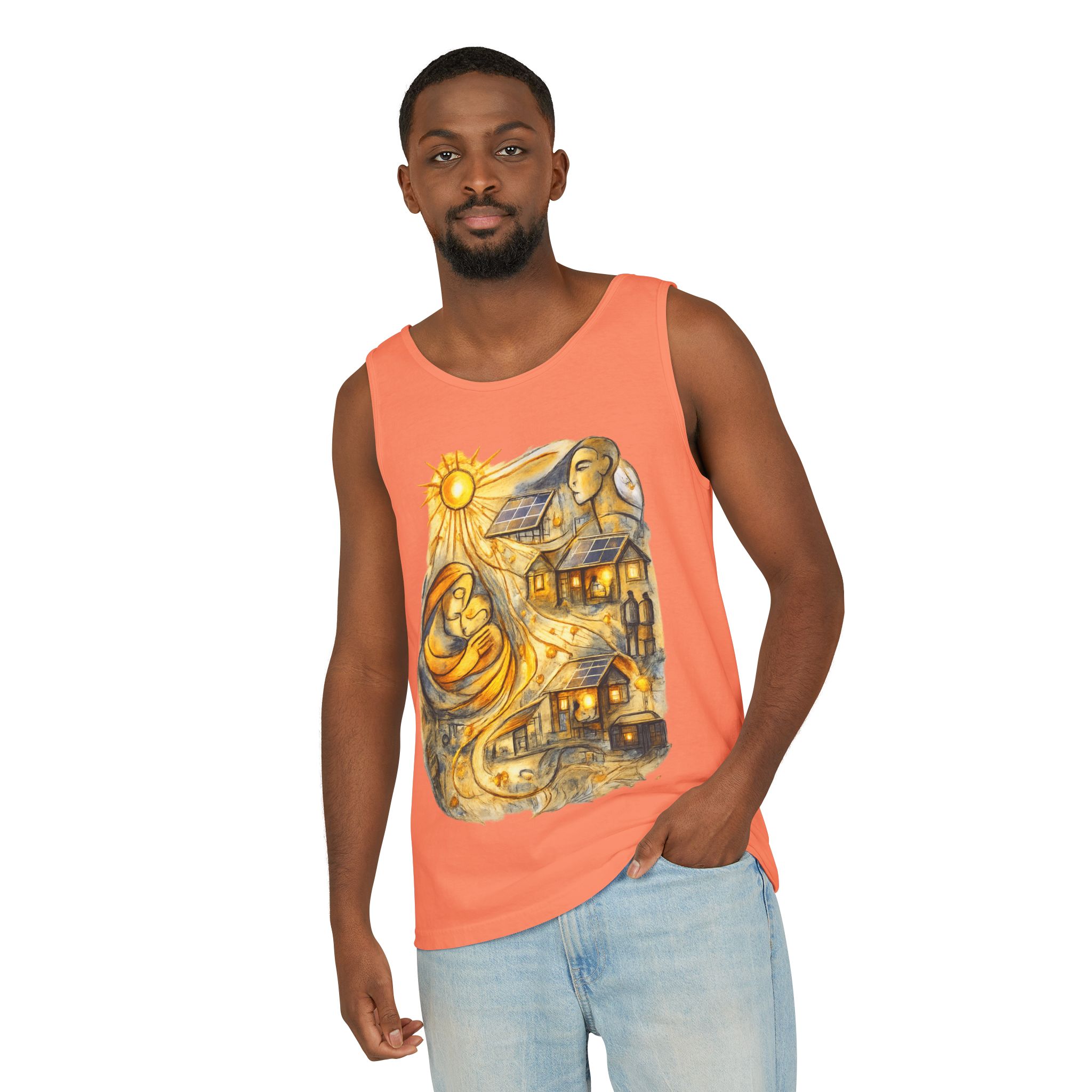 Story: Imagine walking through a weekend market at golden hour. The sun hits the tank’s garment-dyed fabric and the village art catches people’s eyes. It starts conversations about sustainable power and practical aid. For activists, volunteers, and anyone who cares about energy access, this tank becomes an easy, honest way to share a mission without shouting. It’s breathable for outdoor work, soft for downtime, and meaningful when you wear it to fundraiser events or casual meetups focused on community impact.