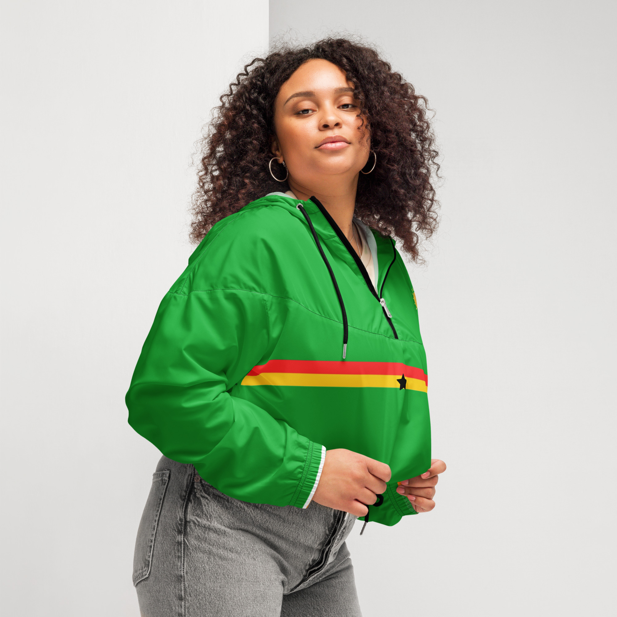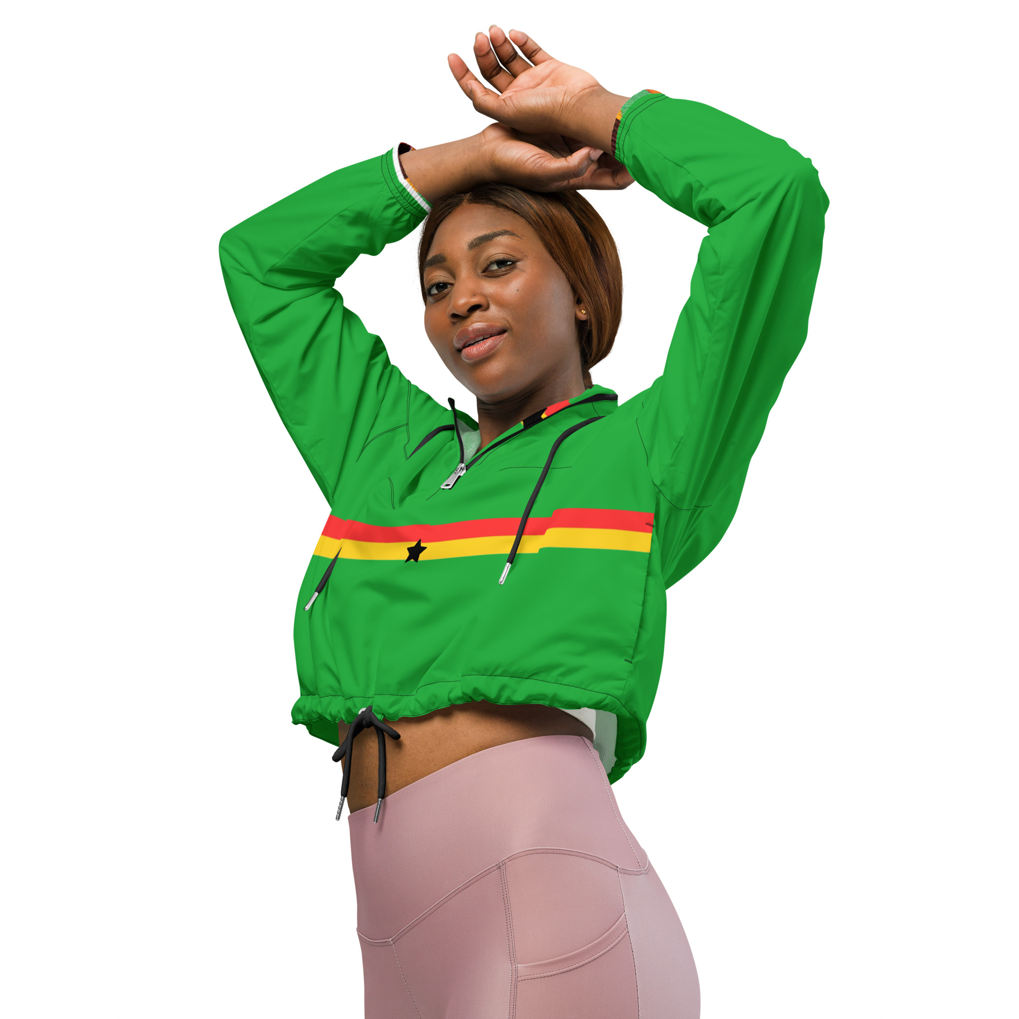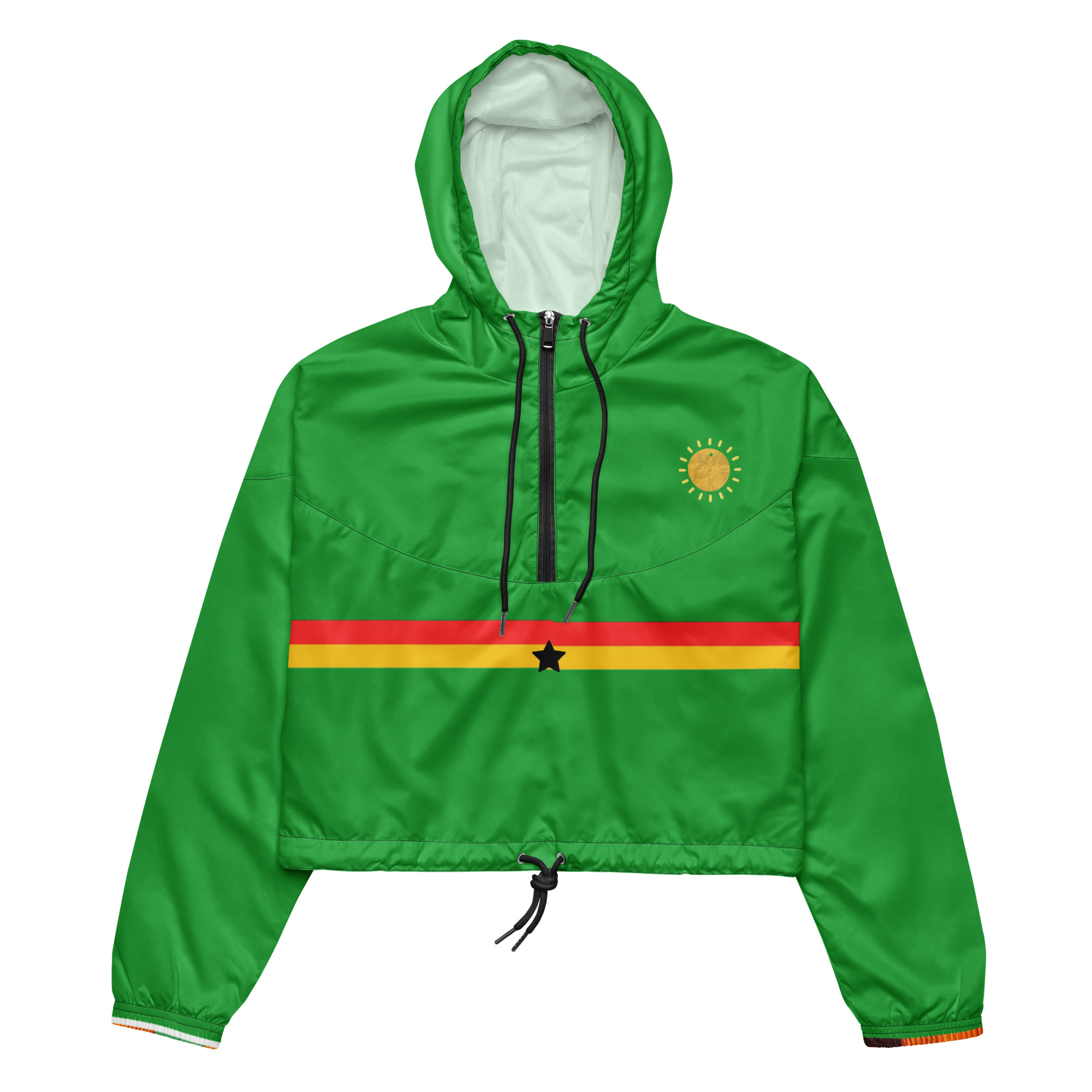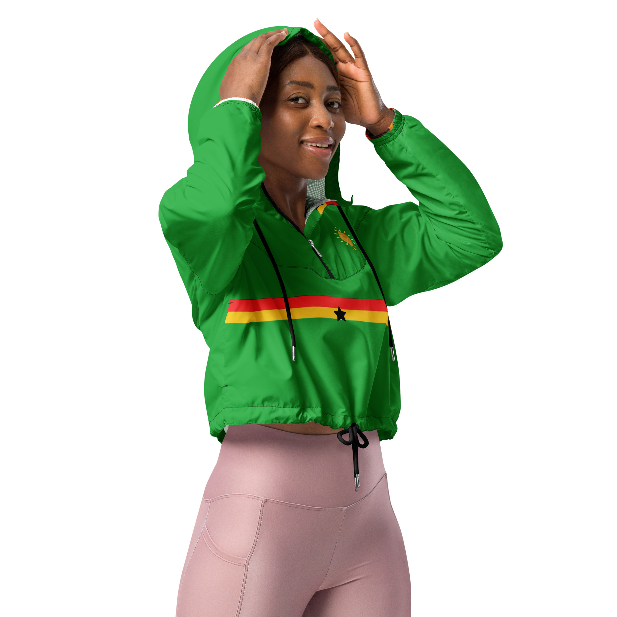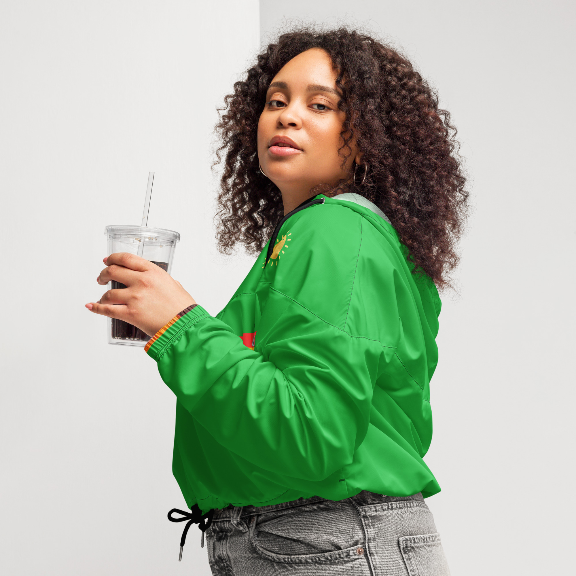 Hike in style without the rain getting in the way—this cropped windbreaker is lightweight, waterproof, and suitable for every kind of adventure. Features include side-slit pockets, breathable mesh lining, and adjustable drawcords on the hood and waist to support all your stylish outdoor looks.